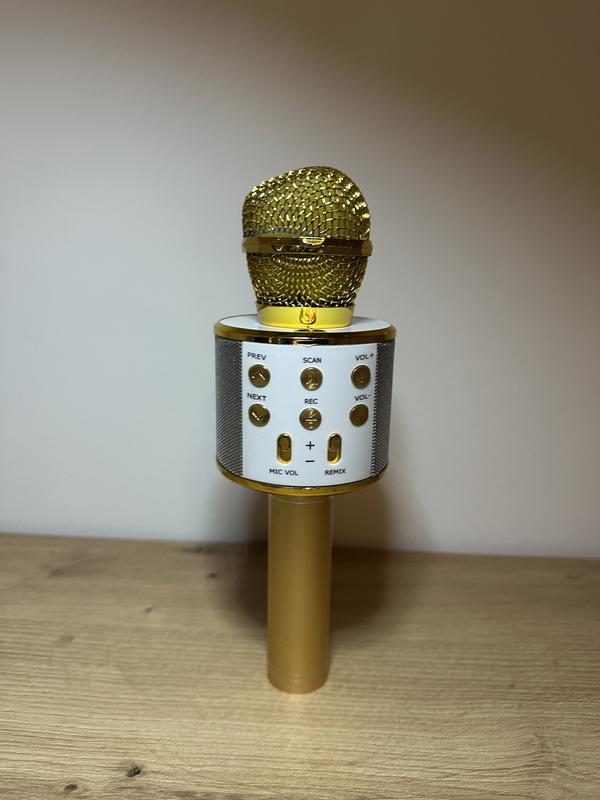 Цей тип мікрофона зазвичай поєднує функції мікрофона, колонки Bluetooth та пристрою для зміни голосу. Бездротовий караоке-мікрофон. Золотистий