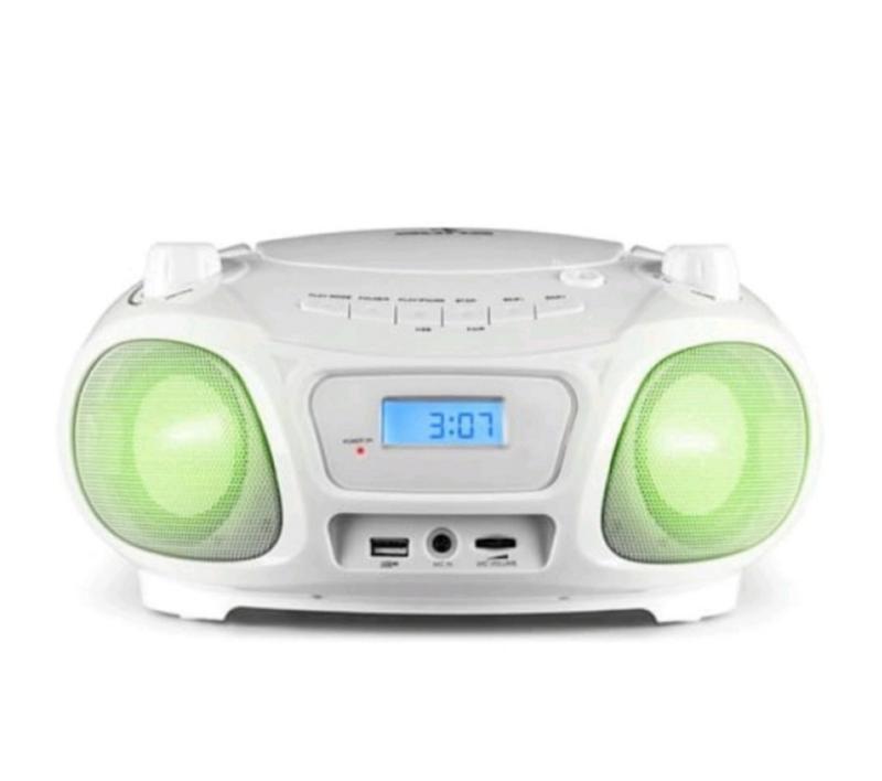 Бумбокс / радио Auna Германия НОВИЙ. Разнообразное музыкальное наслаждение: CD-плеер, FM радио, USB, AUDIO IN, Bluetooth Беспроводная и простая: Bluetooth для подключения смартфонов и планшетов Классные световые эффекты: светодиодный диско-световой эффект Гибкий и мобильный: подходит для работы от сети или от перезаряжаемого аккумулятора Особенности: Поддерживаемые форматы аудио CD-плееры: Audio CD, MP3 и CD-RW Диапазон FM-радио: 87,5 МГц – 108 МГц Входы: AUDIO IN stereo мини разъем Выходы: 3,5 мм разъем для сопротивления наушников 16-32 Ом Версия Bluetooth 3.03.5 мм микрофонный вход Необходимы батареи: 6 х R14 / C Источник питания: 220-240В ~ <unk> 50/60 Гц Комплект поставки: 1 х бумбокс 1 х кабель питания (мiкрофон в комплект не входить) Размеры: 28 х 13 х 26 см (ШхВхГ) Длина силового кабеля: 150 см Вес: 1,3 кг Страна регистрации бренда: Германия Смотрите еще много интересного на моей странице.