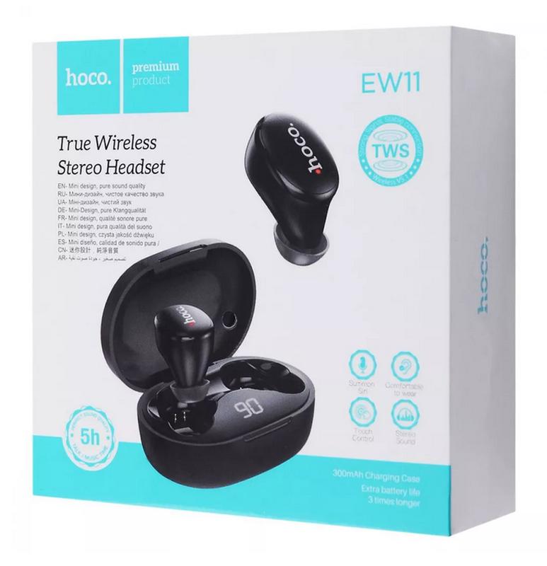 Hoco EW11 TWS -- бездротові навушники із сенсорним управлінням. Основні характеристики: - сумісні з усіма пристроями (включно з iOS, Android, Windows); - підключення через Bluetooth 5.1; - робоча відстань: до 10 м; - оснащені сенсорним управлінням; - ергономічний дизайн; - низький рівень затримки звуку; - LED-індикатор рівня заряду батареї; - можна використовувати разом та окремо; - перемикання ведучого та веденого навушників; - ємність акумулятора навушника: 40 мА*год; - ємність акумулятора зарядного кейсу: 300 мА*год; - час автономної роботи навушників: 5 год; - час роботи у режимі очікування: до 200 год; - час зарядки: ~1 год; - роз'єм для заряджання: Type-C; - у комплекті зарядний кейс, зарядний кабель Type-C, змінні амбушури. Сучасний дизайн Версія Bluetooth 5.1 та низький рівень затримки звуку гарантують чудову якість звучання. Навіть під час перегляду фільмів або ігри на мобільному пристрої звук буде яскравим, чітким та синхронним із зображенням на екрані. Автономність батареї Зарядний кейс оснащений акумулятором на 300 мА*год, заряду якого вистачить на 200 годин у режимі очікування. Самі навушники обладнані акумуляторами на 40 мА*год кожен - ви зможете спілкуватися та слухати улюблену музику до 5 годин без підзарядки. Час заряджання становить близько 1 години, щоб ваші навушники завжди були готові до роботи. А LED-індикатор вчасно нагадає про підзарядку, показавши рівень заряду, що залишився, у відсотках. Сенсорне управління Навушники оснащені сенсорним управлінням, тому ви зможете відповідати на дзвінки, викликати голосового помічника, а також керувати відтворенням музики, не торкаючись смартфону. Можна слухати разом та окремо Ведучий і ведений навушники перемикаються. Слухайте музику у стереорежимі, розмовляйте в режимі "вільні руки", зберігайте чутність навколишнього світу.