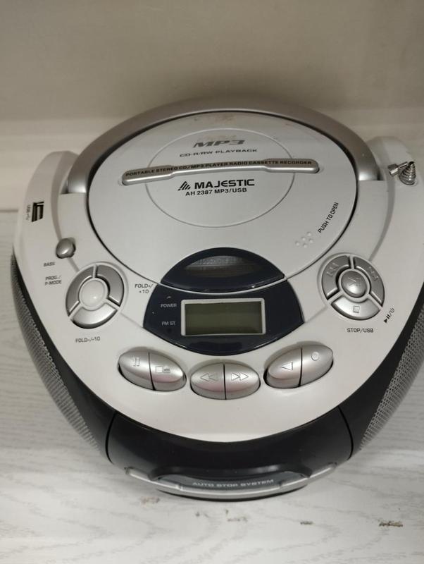 Majestic AH-2387 Технические характеристики Воспроизведение с прямого порта USB FM антенна MP3-воспроизведение FM радио Порты и интерфейсы Линейные выходы наушников Вход Aux Радио Поддерживаемые диапазоны радио AM, FM Тип тюнера Analog Энергопитание Источник питания AC/Battery Оптический привод Поддерживаемые типы дисков CD-DA, CD-R, CD-RW Тип оптического привода Player Кассета Кассетная дека Экран Тип дисплея LCD New Majestic AH-2387. - Тип тюнера: Аналоговый, - Поддерживаемые диапазоны радио: AM, FM. - Тип оптического привода: Проигрыватель, - Поддерживаемые типы дисков: CD-DA, CD-R, CD-RW, - Режимы воспроизведения: Pause, Повтор, Произвольный порядок. - Поддерживаемые форматы аудио: MP3, WMA. - Тип дисплея: ЖК. - Источник питания: Сеть переменного тока / аккумулятор, - Входящее напряжение сети: 230 В, - Частота входящего переменного тока: 50 Гц