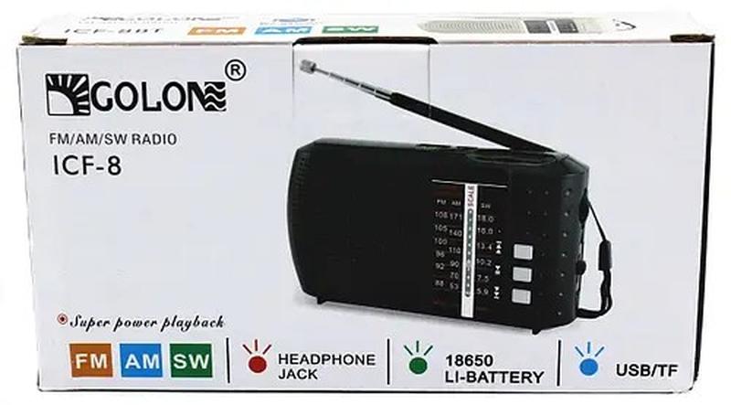 Радиоприемник аккумуляторный с возможностью воспроизведения с USB и microCD флешки радио FM/AM/SW Golon ICF-8 Черный Радиоприемник Golon ICF-8BT - аккумуляторный всеволновой приёмник, оснащенный аналоговым тюнером. Радиоприемник ловит на частотах FM, AM, SW. Выполнено изделие из прочных материалов, благодаря чему прослужит долгое время.Работа радиоприемника осуществляется от аккумуляторной батареи. Особенностью данной модели является возможность воспроизведения с USB и microCD флешки. Характеристики: - Диапазон частот: FM 88 -108 MHz, AM 530 - 1710 KHz, SW 3.9 - 22 MHz, - Аккумулятор: 18650 - Выходная мощность: 3 Вт - Вход для блока питания DC 5V IN - В акустической системе использованы современные динамики высокого качества. - FM/AM/SW радио - С USB/TF - USB-TF-PC Link - Гнездо для наушников - (зарядка через USB провод) - Размер устройства: 13.4X3.5X7.65СМ - Размеры коробки: 15.3*44*8.2CM - Черный Комплектация: 1. Радиоприемник 2. USB провод