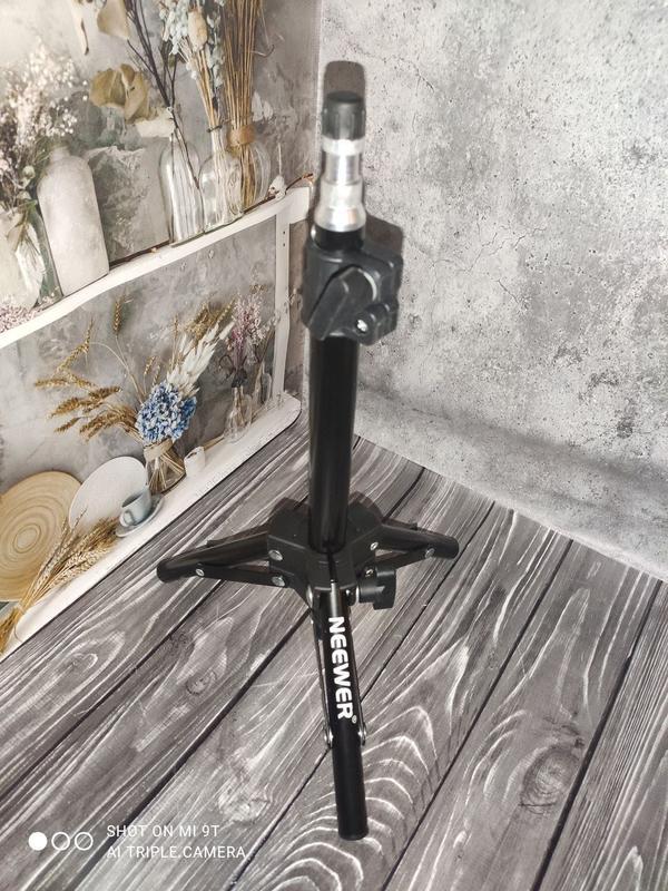 Виробник: Neewer Кілька примірників у наявності Стан нової Neewer це компактна студійна стійка, яка призначений для роботи з невеликими освітлювальними приладами.такої стійки більш ніж достатня при предметній або макро зйомці, коли вам потрібно розмістити невеликі джерела світла максимально близько до об'єкта зйомки.Максимальна висота даної стійки становить 51 див., а мінімальна висота стійки ставити 28 див., Двосекційна стійка оснащена зверху стандартним коннектором, який без проблем можна встановити будь студійний освітлювач або спалах. Виробник: Neewer Стан: Новий Колір: Чорний