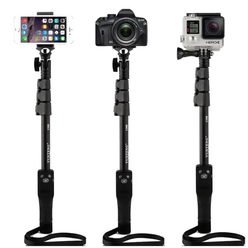 Легкий и практичный селфи монопод для смартфона, фотоаппарата или экшн камеры с дистанционным Bluetooth пультом, со свободной регулировкой длинны. Благодаря применению алюминия и прочного пластика селфи палка имеет низкий вес. Регулировки Фиксация выдвижных частей монопода для телефона осуществляется тремя пластиковыми замками-защелками. Данная конструкция позволяет быстро и надежно выставить нужную длинну в пределах от 42 до 125 см. Головка Yunteng YT-1288 оснащен крепежной головкой, которая имеет регулировку вдоль оси наклона на 180 градусов и оборудована резиновым основанием для лучшей фиксации устройств. Зажим селфи палки выполнен в виде винта-барашка. Крепление Установка устройств на монопод возможна тремя способами - При помощи штативного винта 1/4 дюйма, при использовании DSLR камер и экшн камер - При помощи комплектного держателя для всех телефонов, ширина которых находится в пределах от 55 до 85 мм - Используя адаптер для крепления GoPro на штативную резьбу 1/4 дюйма. Такой вариант актуален для всех экшн камер Ручка монопода изготовлена из текстурированной резины, такое решение позволяет удерживать аксессуар удобно и надежно. В нижней части предусмотрено отверстие с резьбой 1/4 дюйма для установки дополнительного штатива. Пульт управления Для комфортных и удачных селфи или удаленных снимков монопод комплектуется Bluetooth пультом управления для всех устройств как на Android так и iOS. Комплектация В комплект поставки монопода входит сам монопод, Bluetooth пульт управления, держатель для телефона до 7 дюймов, адаптер для экшн камеры, кабель USB/MicroUSB, страховочный ремешок. Особенности селфи монопода Yunteng YT-1288 - Количество сегментов: 4 - Минимальная длина: 42.5 см - Максимальная длина: 125 см - Максимальная нагрузка: 1500 гр (до 2 секций) - Держатель регулируемый: от 5.5 до 8.5 см - Интерфейс камеры: универсальный винт 1/4" - Совместимые с кнопкой операционные системы: iOs 5.0 и выше, Android 4.3 и выше - Радиус действия Bluetooth: 15 м - Время работы от одного заряда: от 8 до 120 часов - Материалы: алюминий, резина, пластик, текстиль - Цвет: черный - Вес: 235 гр