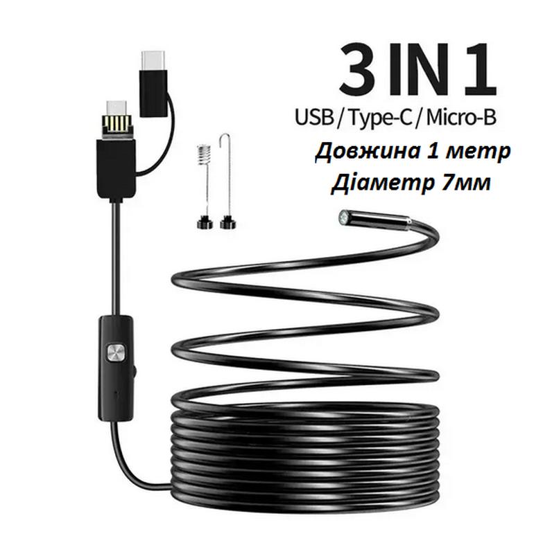 Бороскоп эндоскоп 3 в 1 бороскоп (usb micro usb type-c) 1 метр, 7 мм для телефона android...