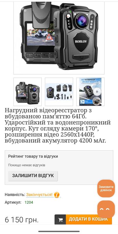 камера покупалась для съёмки ТЦК і поліції если кому надо звоните ********** отвечаю быстро Нагрудный видеорегистратор BOBLOV M5, имеет собственную встроенную память объемом 64 Гб, и аккумулятор 4200 мАч, позволяющий вести непрерывную видеозапись до 15 часов в качестве Full HD 1080P. Максимальное же расширение видео составляет 2560x1440P, а расширение фото 48 Мегапикселей (4352*3264). Широкий угол обзора камеры, составляет 170 градусов и позволяет вести широкоугольную видеозапись и не пропустить ни одной детали. Ночное видение, которое обеспечивают инфракрасные светодиоды в количестве 6 шт, имеет дальность 10 метров. Корпус бодика BOBLOV M5 ударопрочный и выдерживает падение с высоты 2 метра, а также имеет влагозащиту по стандарту IP67, не боится дождя, снега и перепадов температур от -30°C до 55°C Нагрудную видеокамеру М5 можно носить не только на одежде, но и можно устанавливать в автомобиль как видеорегистратор, все необходимые крепления есть в комплекте. Основные особенности: Расширение видео: 2560x1440P Расширение фото: 48М (4352X3264) Угол обзора: 170° Формат видео: MP4; Фото: JPEG; Аудио: WAW Видео кодек: H.264 Экран: 1.54 дюйма Ночное видение: 6IR, дальность до 10 метров Датчик движения: есть Циклическая видеозапись: есть Функции записи: Непрерывная видеозапись Запис по датчику руху Запись в режиме зарядки (от сети или от Powerbank) Фото фиксация Батарея: Lithium polymer, 4200 mAh Зарядка: через USB кабель Время полной зарядки: 5 - 6 часов Продолжительность записи на одном заряде: до 15 часов Рабочая температура: -30℃~55℃ Корпус ударопрочный: выдерживает падение с 2 м. Защита от влаги: IP67 Размеры: 90*30*60мм Комплектация: Боди камера BOBLOV M5, 64Gb USB кабель Крепление клипса длинная Крепление клипса короткая Крепление автомобильное Инструкция