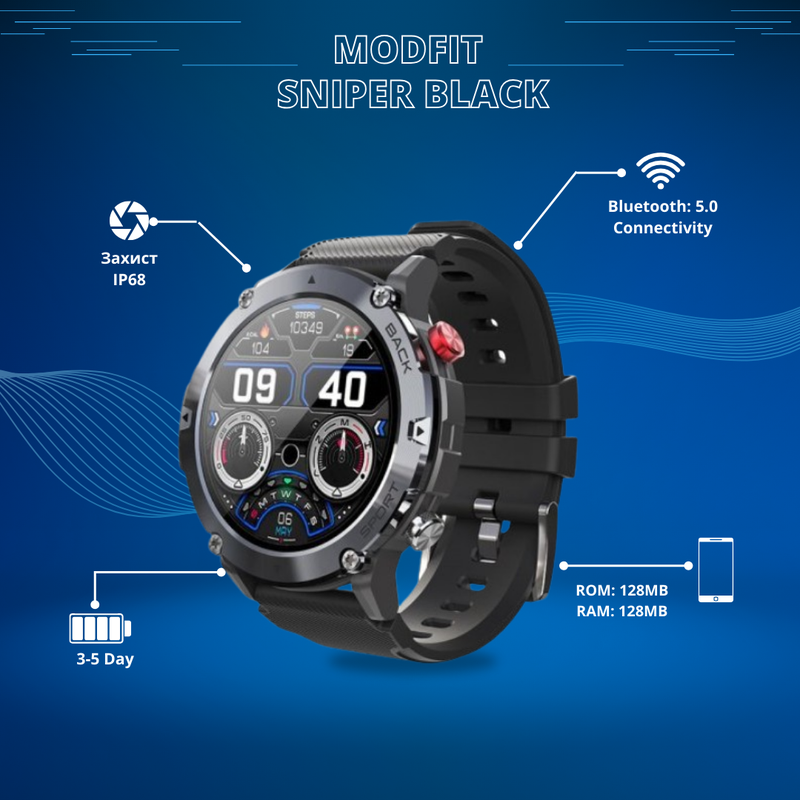 Інноваційний функціонал Цей розумний годинник забезпечує широкий спектр функцій: від крокоміра та підрахунку калорій до моніторингу сну та пульсометра. Тонометр і оксиметр дозволяють стежити за здоров'ям, а прогноз погоди та повідомлення про дзвінки, СМС та соціальні мережі роблять годинник незамінним гаджетом у повсякденному житті. Стильний дизайн Розумний годинник Modfit Sniper All Black має елегантний круглий формфактор з діагоналлю дисплея 1,68 дюйма. Корпус з металу надає пристрою міцності та вишуканості, а силіконовий ремінець гарантує комфорт при носінні. Висока продуктивність Годинник оснащений RAM об'ємом 128MB та ROM 128MB, що забезпечує плавну роботу всіх функцій. Місткість акумулятора в 300 мАч гарантує тривалий час роботи без необхідності частого заряджання. Просунута сумісність Цей розумний годинник підтримує Bluetooth версії 5.0, що забезпечує надійне і швидке з'єднання з пристроями на базі Android 6.0 і вище, а також iOS 9.0 і вище. Додаток Dafit розширює функціонал годинника, роблячи його ще більш універсальним. Надійний захист Пристрій має вологозахист IP68, що робить його стійким до пилу та води, дозволяючи використовувати годинник у різних умовах. Такий рівень захисту робить їх ідеальними для активного способу життя. Деталізований дисплей Роздільна здатність екрана в 360 x 360 пікселів надає чітке і яскраве зображення. Сенсорний кольоровий дисплей полегшує навігацію та робить використання годинника ще зручнішим та приємнішим. Комплект Розумний годинник Modfit Sniper All Black Магнітна зарядка Фірмова упаковка Характеристики Розміри: Висота 48 мм, товщина 11 мм, ширина 48 мм RAM: 128MB ROM: 128MB Ємність акумулятора: 300 мАч Вологозахист: IP68 (5 ATM) Діагональ дисплея: 1,68" Додаток: Dafit Матеріал корпусу: Метал Матеріал ремінця: Силікон Мова: Українська мова Підключення Bluetooth: 5.0 Роздільна здатність екрана: 360 x 360 пікселів Сумісність: Android 6.0 та вище/ iOS 9.0 і вище Тип дисплея: Сенсорний кольоровий Тип заряджання: Магнітна зарядка Виберіть розумний годинник Modfit Sniper All Black для сучасного, активного та технологічного способу життя. Їхні просунуті функції, стильний дизайн та надійний захист зроблять ваше повсякденне життя комфортнішим та цікавішим.