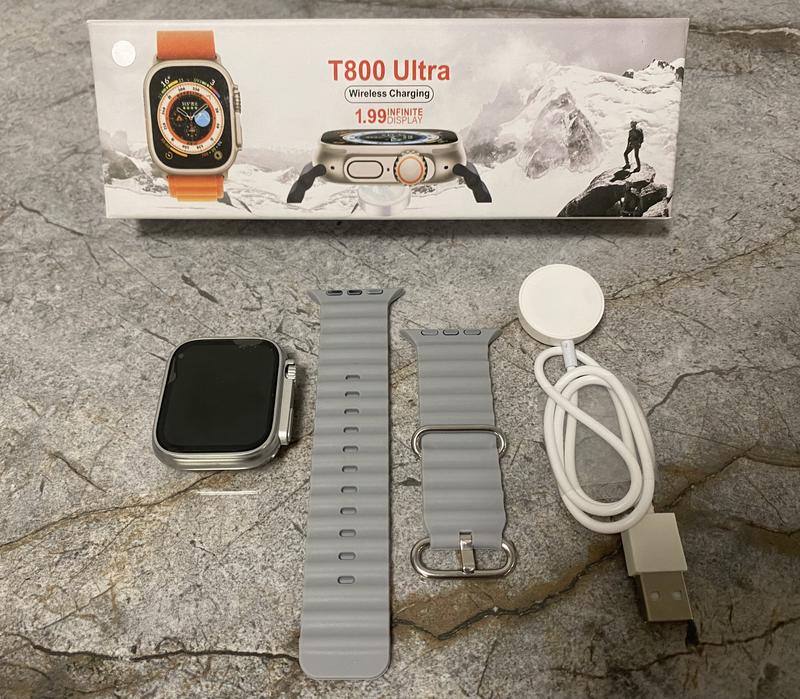 Смарт-годинник T800 Ultra з бездротовою зарядкою. Особливості: У смарт-годиннику є датчик серцевого ритму, який збирає дані про частоту серцевих скорочень протягом 24 годин. Smart Watch Ultra також допомагає вам контролювати свій сон завдяки повному моніторингу сну. Він також має крокомір і дозволяє контролювати та оцінювати калорії, спалені протягом дня.Оснащений динаміком та мікрофоном, що дозволяє здійснювати дзвінки безпосередньо через смарт-годинник. Характеристики: • Країна виробник: Китай; •Тип: Смарт-годинник; •Версія: Bluetooth 4.0 •Сумісні: з IOS, Android; •Діагональ дисплея: 1.54 дюйми; •Роздільна здатність дисплея: 240X240; •Тип заряджання: дротова; •Матеріал корпусу: алюмінієвий сплав+пластик; •Матеріал ремінця: силікон; •Місткість акумулятора: 210 mAh; •Розміри: 44Х38Х10.7 мм; •Вага: 50 гр Комплектація: •Годинник; •Ремінець(колір-сірий); •Бездротова зарядка; •Інструкція (на англ.мові)