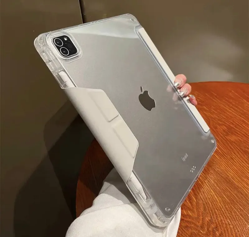New Smart Origami pencil groove — це чохол з оновленим дизайном для iPad з відділом для Pancil. Origami pencil groove має три режими підставки: зможете підібрати ідеальний варіант для себе під час перегляду відео або під час роботи. Задня частина повністю прозора та спочатку на ній є захисна плівка (не забудьте її зняти). На прозорій накладці є стильна металева емблема з написом «logfer», що слугує для надійного примагнічування й закриття чохла завдяки магнітам у верхній частині кейса. Це дає можливість міцно утримувати iPad у чохлі під час транспортування. У комплекті йде захист на камеру залежно від моделі iPad. Новий чохол стане надійним захистом і стильним аксесуаром. Конструкція чохла гарантує комфортне використання пристрою, легкий доступ до портів і кнопок та інших функціональних елементів керування iPad.