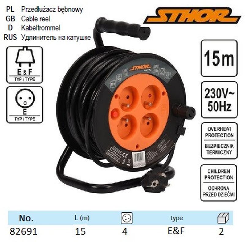 Подовжувач електромережевий на котушці sthor : l=15 м, 4 гнізда, 3-жильний, ø=1 мм², ip44...