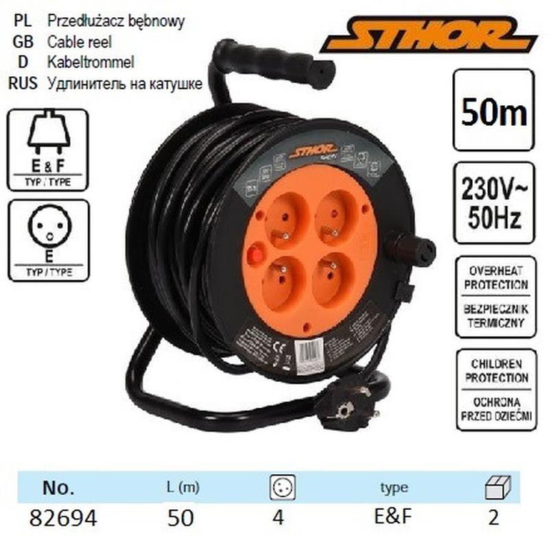 Подовжувач на котушці sthor l=50 м 4 гнізда 3 жили ø=1.5 мм2 vorel-82694
