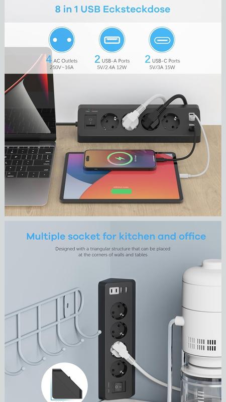 Угловая розетка с 2 портами USB и 2 портами Type-C, 4-позиционная многорозеточная розетка с выключателем, сетевой фильтр, защита от перенапряжения, кабель 2 м для кухни (черный)