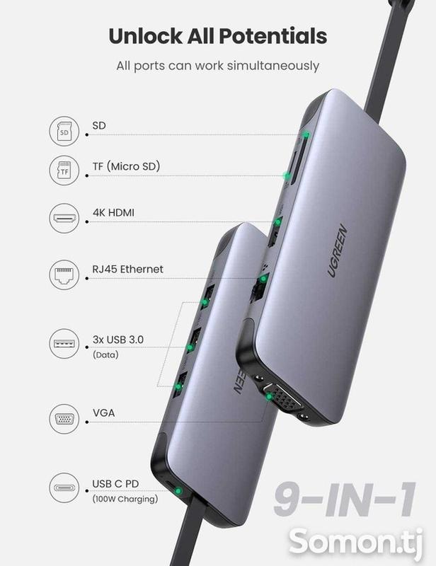 Сток мультифункціональний адаптер ugreen usb-c hub 9 in 1
