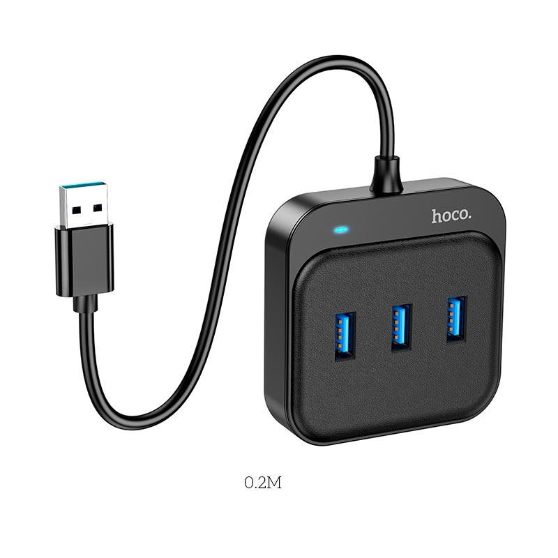 Hoco HB31 4 in 1 (USB to 4xUSB3.0 3) (0.2m) – компактний хаб-перехідник для пристроїв з інтерфейсом USB. Основні характеристики: - інтерфейс підключення: USB - 4 порти USB 3.0 - довжина кабелю: 0.2 м; - матеріал: АБС-пластик. USB Hub Hoco HB31 Easy 4-in-1 — це високотехнологічний аксесуар, який надасть можливість під'єднати до одного USB-роз'єму настільного комп'ютера або ноутбука кілька пристроїв, забезпечивши їх повноцінне функціонування. Модель реалізована в оригінальному дизайні, має невелику вагу, компактні розміри та практичну конструкцію, що забезпечує комфортну повсякденну експлуатацію. Корпус хаба виготовлений у квадратній формі з округленими кутами, виготовлений із міцного ABS-пластику, який вирізняється стійкістю до ударів і подряпин. На верхній панелі хаба міститься LED-індикатор для контролю його стану та виділена, злегка піднята зона з приємною на дотик текстурованою поверхнею, в якій розташовані 3 порти USB3.0 типу female. На його нижній панелі є невеликі накладки, що запобігають ковзанню, на одній із бічних граней — ще один порт USB3.0 (female), а на другій — вихід вбудованого кабелю. Кабель завдовжки 0.2 м захищений міцним обплетенням і обладнаний інтерфейсом USB3.0 (male).