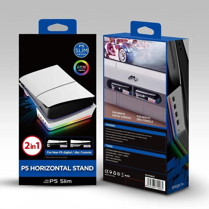 Горизонтальна підставка з підсвіткою для PS5 Slim (2023) Ідеальна сумісність з цифровою та дисковою версією PS5 Slim! Переваги: – 4 USB-порти: заряджайте геймпади, підключайте жорсткі диски, клавіатури, телефони та більше – Яскраве RGB-підсвічування: 14 режимів, перемикається окремою кнопкою – Крутий дизайн: горизонтальна установка економить місце та покращує охолодження – Легка установка без інструментів – Силіконові ніжки для стійкості та захисту від подряпин – Надійна фіксація PS5 Slim + ефективне розсіювання тепла У комплекті: – 1 підставка (з двох частин) – USB-кабель – Інструкція Чудовий подарунок для фанатів PlayStation! Зробіть свою PS5 ще стильнішою та функціональнішою!