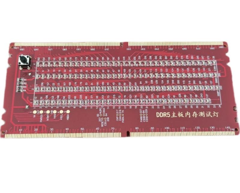 Тестер оперативної пам'яті для стаціонарних ПК DDR5. У процесі запуску та читання оперативної пам'яті може вказувати на несправності в ланцюзі материнської плати для подальшого ремонту. Несправність може бути відбита світлодіодним індикатором, що вказує на обривання ланцюга або коротке замикання, або на лінію даних і адресну лінію. Застосування: Материнську плату не потрібно вмикати, натисніть кнопку тестера. Якщо всі світлодіоди горять і яскравість однакова, сигнал у порядку, проблем немає. Немає світла або слабкий світловий сигнал є проблема, ви маєте звернутися до індикації знака поруч із цим світлодіодом.