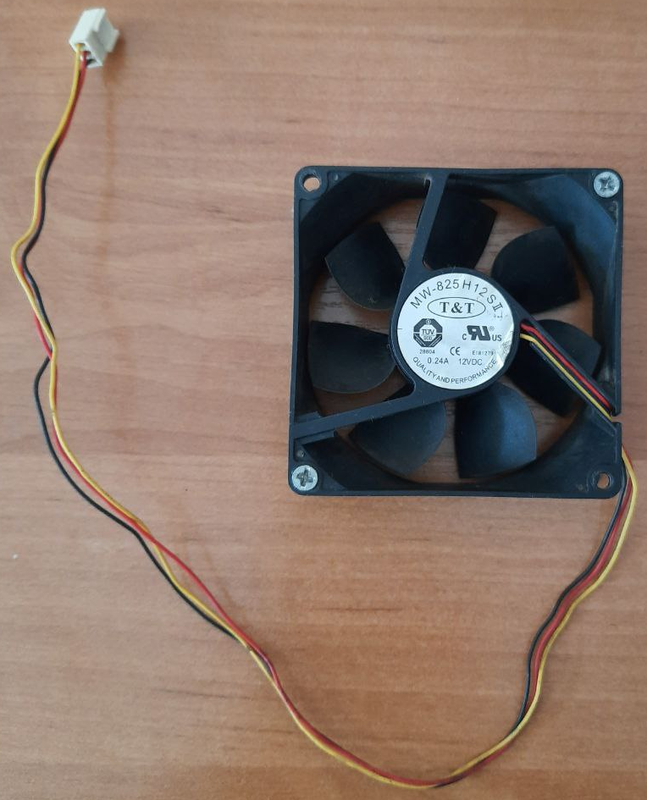 Брендовий вентилятор T&T MW-825H12S II 80x80x25 мм 3 pin протестований. Дує добре, як результат присутній шум, який я о характеризував би як середній. Оберти вентилятору в районі 2800-2900 обертів за хвилину(дивіться третє зображення: пункт "Вентилятори" - "Шасі #3"). В комплекті надаються гвинти для кріплення вентилятору.