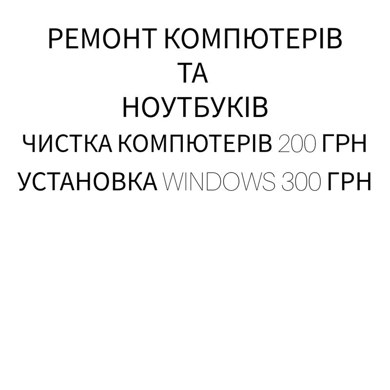 Ремонт віх компютерів, ноутбуків за маленьку ціну, якщо що допоможу вам знайти проблему самому дістанцийно і допомогти за 300 грн, чістка компютерів буде коштувати 200 грн, установка windows буде коштувати 300 грн. ЗРОБИМО ВСЕ ШВИДКО, ЧЕСТНО, ТА ДЕШЕВО