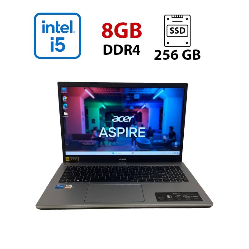 Характеристики Модель: Acer Aspire 5 A315-59 Екран (діагональ, роздільна здатність, тип матриці): 15.6" (1920x1080) IPS Процесор: Intel Core i5-1235U (10 (12) ядер по 1.3 - 4.4 GHz); Cache Memory 12 MB Оперативна пам'ять: 8 GB DDR4 Постійна пам'ять: 256 GB SSD Графіка: інтегрована Intel Iris Xe; до 1792 MB (до 1792 MB с ОЗП) Веб-камера: є Порти: 2x USB 3.2, 1x USB Type-C, 1x HDMI, 1x Audio Port Combo, LAN (RJ-45), 1x Card Reader (SD, SDHC, SDXC) Батарея: не менше 2 годин в режимі звичайного навантаження Вага: 1.78 кг Стан: б/в (клас А: хороший стан; без дефектів; можуть бути сліди звичайного використання) Комплектація: ноутбук, зарядний пристрій, наклейки на клавіатуру