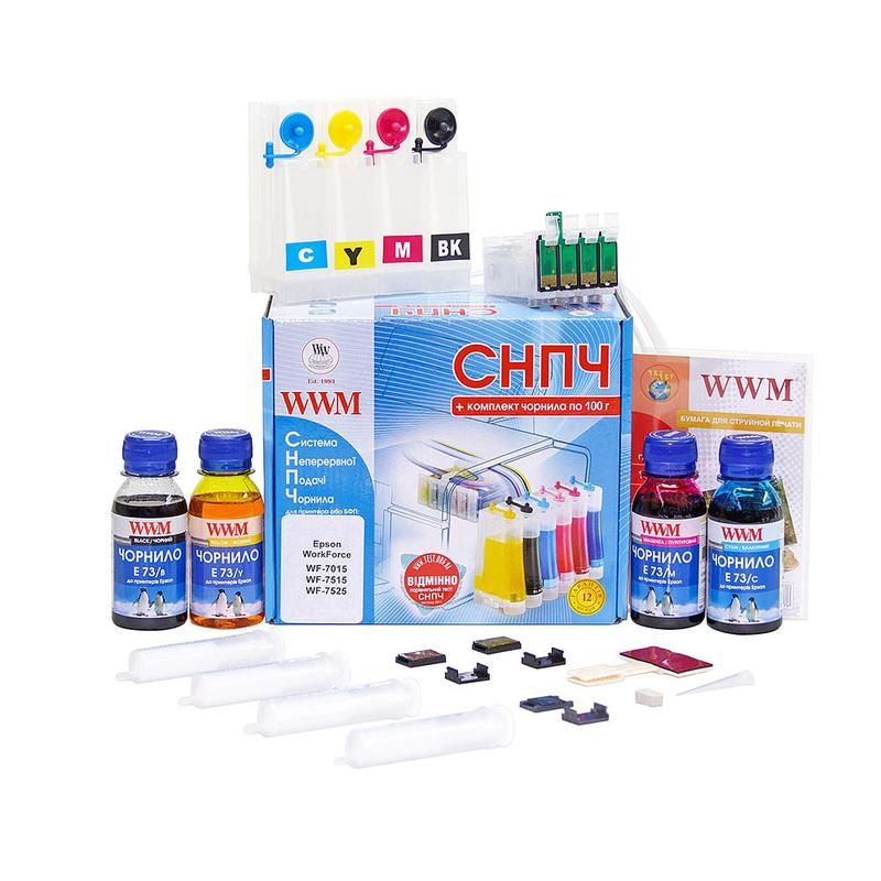 Система непрерывной подачи чернил WWM для Epson WorkForce WF-7015/7515/7525 (IS.0251) Система непрерывной подачи чернил (СНПЧ) -- устройство для струйного принтера, подающее чернила к печатающей головке из пополняемых резервуаров (ёмкостей- доноров). Использование СНПЧ снижает затраты на печать в десятки раз. СНПЧ состоит из резервуаров для чернил, которые соединены силиконовым шлейфом с блоком картриджей с планкой чипов. Блок картриджей с планкой чипов устанавливается вместо оригинальных картриджей в каретку принтера. Планка чипов СНПЧ имитируют работу оригинальных чипов, а после программного окончания чернил в картриджах, позволяет восстановить этот уровень до 100%. Преимущества СНПЧ WWM: • Гарантия на СНПЧ и печатающее устройство 12 месяцев. См. гарантийное обязательство; • Гарантийный срок годности чернил WWM - 5 лет (чёрные пигментные - 3 года, цветные пигментные - 2 года); • СНПЧ WWM укомплектовано набором чернил - по 100 гр. каждого цвета; • Пошаговая инструкция с фотографиями по установке СНПЧ; • Сервисная поддержка в авторизованных сервисных центрах WWM (АСЦ) по всей Украине; • Простота и удобство в использовании; • Надёжная работа системы подтверждена тестированием в собственном испытательном центре компании; • Наличие демпферного компенсатора перепадов атмосферного давления обеспечивает стабильную работу СНПЧ WWM. Комплектация СНПЧ: • ёмкости-доноры с силиконовым шлейфом для подачи чернил; • блок картриджей с планкой чипов; • набор профессиональных чернил 4 по 100г E73/B, E73/C, E73/M, E73/Y; • фиксаторы шлейфа подачи чернил - 2 шт.; • шприцы для заправки чернил - 4 шт.; • перчатки - 1 пара; • салфетка; • инструкция. Совместимость с печатающими устройствами: Epson WorkForce WF-7015, WF-7515, WF-7525. Производитель: Worldwide Manufacturing, E.D. (торговая марка WWM) - украинская компания, которая специализируется на производстве совместимых расходных материалов для принтеров. Контроль качества производства продукции сертифицирован по международному стандарту ISO 9001. Отправка Новой почтой, Укрпочтой после 100% предоплаты. Наш магазин DigitalStyle порадует Вас широчайшим ассортиментом компьютерных комплектующих, компьютерных аксессуаров и расходных материалов для печати. Ассортимент, который мы можем предложить Вашему вниманию значительно обширнее, если Вы не нашли интересующий товар здесь, обратитесь к нашему менеджеру. Всегда рады Вам!