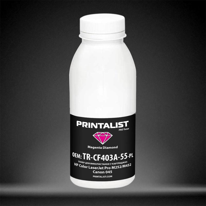 ![CDATA[ Тонер PRINTALIST для HP CLJ Pro M252/M452, Canon 045 бутль 50г Magenta (TR- CF403A-55-PL) для Принтерів: COLOR LASERJET ENTERPRISE M 480 I-SENSYS LBP LBP653Cdw I-SENSYS MF MF645, MF655 LBP 673 MF 752, 754 Canon I-SENSYS LBP LBP-621CW, LBP-623Cdw, LBP-663Cdw, LBP-664Cx Canon I-SENSYS MF MF631CN, MF633CDW, MF635CX, MF641Cw, MF643Cdw, MF732CDW, MF734CDW, MF735CX, MF742Cdw, MF744, MF746cx Canon LBP 611CN, 613CDW, 654CX HP COLOR LASERJET ENTERPRISE CP4025, CP4525 HP COLOR LASERJET PRO M M252, M254, M274N, M277DW, M280, M281, M377, M452, M477, M479 HP LASERJET ENTERPRISE M455 HP LASERJET PRO M 255, 282, 283, M155, M182, M183, M454 для Картриджів: HP 201A Magenta (CF403A), HP 201X Magenta (CF403X), HP 207X Magenta W2213X, Canon 045 Magenta (1240C002), Canon 045H Magenta (1244C002), HP 203A Magenta (CF543A), HP 203X Magenta (CF543X), Canon 046H Magenta (1252C002), Canon 054 Magenta (3022C002), Canon 055 Magenta 3014C002, HP 415A Magenta W2033A, Canon 054H Magenta (3026C002), HP 216A Magenta W2413A, HP 207A Magenta W2213A, Canon 069 Magenta 5092C002, HP ]]