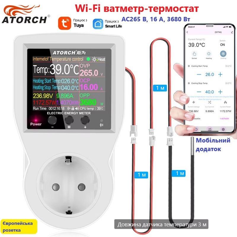 Діапазон вимірювання напруги (AC): 85-265 В; Є внутрішнє реле струму 10 А, Діапазон вимірювання сили струму: 0-10 A; Максимально допустима сила струму: 16 A; Максимальна потужність: 3680 Вт; Клас точності: 1 (похибка 1%); Частота: 50 Гц; Робоча температура: -10...60 С; Розміри: 133*76*73 мм; Маса: 160 г; Дисплей: LCD, 2.4"; Функції: Віддалене керування; Таймер для вимкнення включеного приладу; Дистанційне вимкнення; Захист від перевантажень (по струму); Лічильник спожитої електроенергії Розрахунок вартості спожитої електроенергії. Прилад сумісний з Alexa від Amazon і Google асистентом. Легке налаштування через додатки Smart life або Tuya. QR код для завантаження буде відображатись на екрані при включенні приладу в електричну мережу. Діапазон вимірюваних температур: -20 - 120 С; Точність вимірювання: 1%. Цифровий Wi-Fi ватметр. Wi-Fi енергометр. Прилад для вимірювання параметрів електроенергії Розумна розетка Atorch S1-Wi-F Розумна розетка з термопарою Wi-Fi термостат