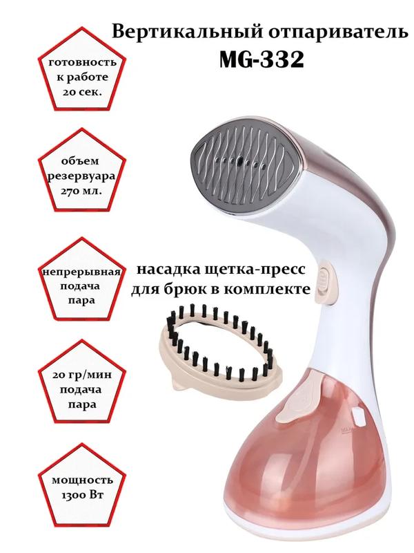 Вертикальный отпариватель MG-332 --это современное устройство, позволяющее гладить одежду и домашний текстиль, не затрачивая много усилий. Также он быстро и эффективно позволит обработать горячим паром одежду, очищая и дезинфицируя её. Отпаривателем невозможно повредить даже самую тонкую и капризную ткань -- ни синтетическую, ни натуральную. Изделие соприкасается только с паром. Мощность составляет 1300 Вт, что является залогом высокой скорости глажки. Отпариватель имеет современный дизайн. Производительность подачи пара составляет 20 грамм в минуту, что позволяет разгладить даже самые сложные складки. Вертикальный отпариватель с таким набором возможностей значительно облегчит жизнь, в особенности, если в доме дети. Характеристики: - Тип - вертикальный - Мощность - 1300 Вт - Объём ёмкости для воды - 270 мл - Подача пара - 20 г/мин - Щетка в наборе - Готовность к использованию - 20сек - Световой индикатор готовности - есть - Функция "Антикапля" - Защита от перегрева - Блокировка паровой кнопки для автоматического непрерывного выпуска пара - есть