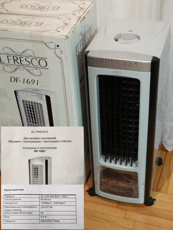 Дистанционно управляемый обогреватель / охладитель / увлажнитель воздуха. Оригинальный климат-комбайн, EL Fresco DF-1691. Многофункциональность прибора способствует его использованию в течение целого года. Нагревательный элемент керамический, мощность 2000Вт. Рассчитан для обогрева помещения площадью до 25кв.м. Два уровня мощности: 2000/1000 Вт Функция вентилятора работает на обогрев и на охлаждение. Три уровня подачи воздуха: интенсивный, средний.низкий. Зволожувач. Допустимый объем воды 8 л. 4 функции увлажнения. Очиститель воздуха Ионизатор Автоматические жалюзи. Корректировка направления потока воздуха. Эффект камня. Пульт дистанционного управления. Таймер на 7,5 годин Габарити: 26,0 см * 33,5см *71,5см. Вага 9,5 кг Придбавный в 2010роке. В отличном рабочем состоянии. Фото No 4, No5. Использовался в загородном доме один сезон на обогрев. Остальное время просто стоял. В комплекте инструкция по эксплуатации на двух языках: украинский и английский, и родная коробка ( с одной стороны повреждена, но починена).