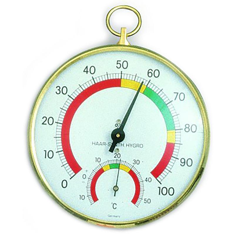 - Назначение: измерение температуры и относительной влажности воздуха - Тип: механический - Установка: на стену Измерение температуры воздуха: - Единицы измерения температуры: градусы по Цельсию - Диапазон измерения температуры: от -10°С до +50°С - Точность: ± 1 °C Измерение относительной влажности воздуха: - Диапазон измерения: от 0% до 100% - Точность: ± 1 % Особенности: - Цветная шкала - Золотистый корпус - Механизм: синтетический волос, что обеспечивает высокую точность измерения - Диаметр устройства: 100 мм - Вес: 105 г