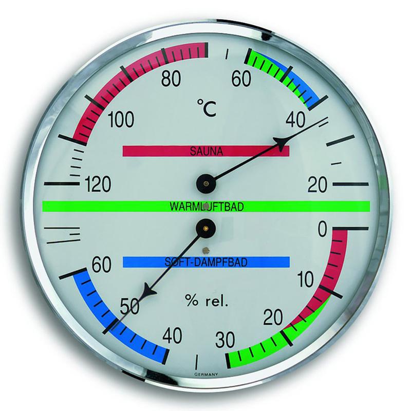 - Термометр-гигрометр для сауны - Минимальная измеряемая температура: +20 °C - Максимальная измеряемая температура: +120 °C Особенности: - Цветная шкала - Материал корпуса: пластик - Габариты (d): 135 мм Страна производитель: Германия