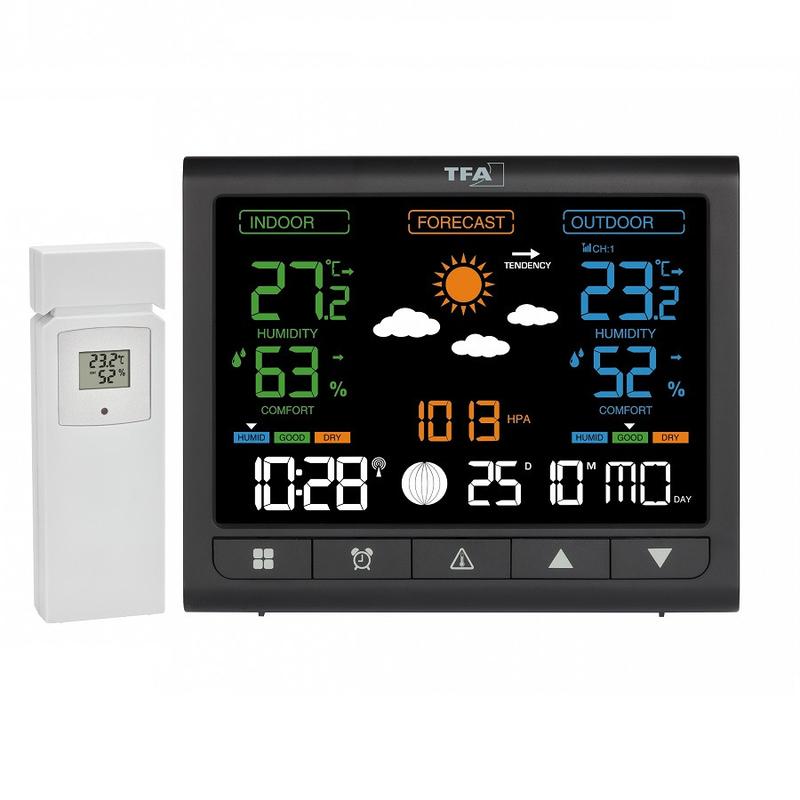 Метеостанція цифрова TFA CONTRAST 35117101 Безпровідна метеостанція CONTRAST має VA дисплей, який відрізняється високою точністю передачі кольору та яскравими кольорами, а також широким кутом огляду. Символи погоди розширюють дисплей і дають прогноз на майбутню погоду на основі виміряних змін атмосферного тиску. Зовнішня температура і вологість на місці визначаються за допомогою комплектного радіопередавача. Температура і вологість відображаються на дисплеї для керування мікрокліматом у приміщенні. За допомогою цілеспрямованого опалення та вентиляції можна створити приємний і здоровий мікроклімат і навіть заощадити на витратах на опалення. Метеостанція пропонує безліч додаткових функцій. Ви можете встановити сигнал тривоги для температури та отримати найвищі та найнижчі значення. Стилізований місяць підсвічується повністю або частково, залежно від фази. Радіокерований годинник з датою та днем тижня (7 мов) доповнює інформаційне наповнення. ФУНКЦІЇ - Безпровідний датчик зовнішньої температури та вологості (433 МГц), дальність дії до 60 м (на відкритому просторі) - Температура та вологість у приміщенні - Рівень комфортної вологості в приміщенні та на вулиці - Прогноз погоди з символами та тенденцією зміни погоди - Абсолютний або відносний атмосферний тиск - Макс./Мін. значення та індикатори тренду для температури та вологості - Температурна тривога - Фаза місяця - Радіокерований годинник з датою та днем тижня (7 мов) - Будильник з функцією повтору, регульований інтервал повтору - Можливість ручного налаштування та корекція часового поясу - Висококонтрастний кольоровий VA дисплей з двома рівнями яскравості (з підключенням до мережі) - Настінне кріплення або настільна підставка - Опційно: Можливість розширення до 3 датчиків температури-вологості (продаються окремо), також для клімат-контролю віддалених приміщень, наприклад, дитячої кімнати, винного льоху і т.д. ЗНАК ЯКОСТІ TFA Продукція від TFA переконує у функціональності та дизайні. Комплектація Базова станція, датчик, адаптер живлення, інструкція з експлуатації Діапазон вимірювання кімнатної температури 0...+50°C Діапазон вимірювання зовнішньої температури -40...+70°C Діапазон вимірювання вологості 10...99% Годинник З радіоконтролем (DCF77 - сигнал) та корекцією часового поясу +12/-12 год Дальність передачі значень від датчика 60 м на відкритому просторі Максимальна кількість датчиків 3 Датчик у комплекті 30.3258.02 Датчик опційн********************астота передачі 433 МГц Матеріал Пластик Колір Чорний Встановлення Настінний або окремо встановлений Живлення Батарейки, адаптер живлення (вилка ЄС) Тип батарейок 3 x 1.5 В AAА (базова станція), 2 x 1.5 В AAА (датчик) Батарейки у комплекті Ні Розміри (L) 140 x (B) 25 (58) x (H) 116 (113) мм Вага 204 г Розміри пакування 125 х 85 х 180 мм Вага з пакуванням 456 г EAN 4009816041661 - Базова станція - Датчик - Адаптер живлення - Інструкція з експлуатації