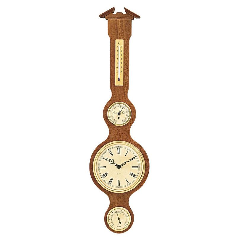 Настінна метеостанція Moller 204982 Oak Country-Style складається з барометра, гігрометра, термометра та годинника з великим циферблатом, об'єднаних у дерев'яному корпусі. Вся продукція Moller виробляється з твердих порід дерева, а саме з бука, поверхня шліфується, після чого корпус покривається спеціальними складами лаку для надання необхідної довговічності, кольору та текстури деревини дубу. Барометри Moller адаптовані для нашого ринку та мають шкалу не тільки в мілібарах (гектопаскалях), але й у міліметрах ртутного стовпа. У даній моделі використаний годинниковий механізм від провідного виробника підлогових, настінних та настільних годинників Німеччини - компанії Hermle. Якість та надійність продукції Moller підкріплені п'ятирічною гарантією. Moller Therm GMbH є сімейною компанією у третьому поколінні, яка ось уже понад 50 років спеціалізується на виробництві аналогових інтер'єрних барометрів, гігрометрів та термометрів, призначених для домашнього використання. Навіть в часи всесвітньої глобалізації все виробництво компанії досі розміщене виключно в Німеччині, в селищі Кройцвертгайм (Баварія). За сьогоднішніми мірками компанію можна назвати крафтовим виробником, який виготовляє свою продукцію з натурального дерева виключно під замовлення. Таким чином виробник може проконтролювати якість своєї продукції та без побоювання надати гарантію терміном 5 років на свої вироби. Функції: Годинник: - Механізм: аналоговий, кварцовий - Формат часу: 12 год - Точність ходу годинника: +/- 1 хв/міс Прогноз погоди: - Прогноз погоди на 8-12 годин (циферблат відображає погоду, яка за прогнозом встановиться через 8-12 годин) - Символьний прогноз погоди. На циферблаті нанесені два символи (сонячно, дощ) - Прогноз погоди визначається за напрямком руху стрілки барометра відносно маркерної стрілки Атмосферний тиск: - Одиниці виміру: мм. рт. ст., мбар або гПа (Міліметри ртутного стовпа / мілібари або Гектопаскалі). - Діапазон вимірювання атмосферного тиску: від 715 мм. рт. ст. до 805 мм. рт. ст. (від 953 мбар до 1073 мбар або від 953 гПа до 1073 гПа). - Дискретність виміру: 1 мм. рт. ст. (1 мбар, або 1 гПа) - Точність вимірювання: +/- 5 мм. рт. ст. (+/- 5 мбар або, +/- 5 гПа) - Відображення тенденції атмосферного тиску (Відхилення стрілки вліво від маркера - тиск падає / Відхилення стрілки вправо від маркера - тиск зростає) - Можливість калібровки Температура в приміщенні: - Одиниці виміру: ºС - Діапазон виміру: от -4°C до +50°C - Дискретність виміру: 1°C - Точність виміру: +/- 1C° Вологість в приміщенні: - Одиниці виміру: % RH - Діапазон виміру: от 0% до 100% - Дискретність виміру: 1% - Точність виміру: +/-5% - Можливість калібровки Характеристики і комплектація: Циферблат: - Розмір циферблату годинника: 135x135 мм; - Розмір циферблату барометра: 65x65 мм; - Розмір циферблату гігрометра: 65x65 мм; - Колір цифеблату: під золото; - Колір оправи циферблату: під золото; Особливості конструкції: - Матеріал корпуса: натуральне дерево (бук) - Установка: на стіні - Колір корпуса: Oak Country-Style (дуб) Живлення: - Годинник: батарейки AА (LR06) 1.5V х 2 шт Комплектація: - Метеостанція - Батарейки AA (R06) 1.5V х 1 шт - Інструкція українською мовою Розміри і вага: - Розміри метеостанції без упаковки, мм: 610х165х40 - Розміри в упаковці, мм: 625х170х60 - Вага метеостанції без упаковки, кг: 0.860 - Вага в упаковці,, кг: 1.120 Термін гарантії: 5 лет Виробник: Moller (Germany)