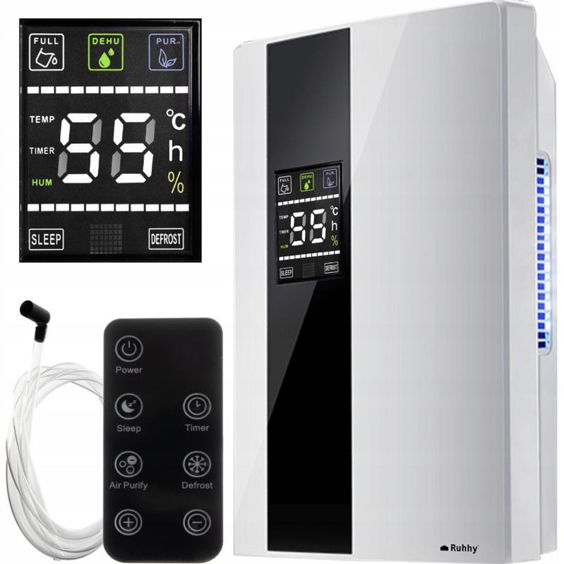 ## Осушувач повітря з гідростатом, РК-дисплеєм і 24-годинним таймером - Надефективний осушувач - цей унікальний осушувач прекрасно вловлює і видаляє воду, що зібралася в повітрі. Модель працює на основі технології Пельтьє. Цей осушувач також безшумний і не заважатиме вам під час повсякденної діяльності чи роботи. Він легко може працювати всю ніч і не порушить ваш сон, а навпаки, зробить його кращим. - Гідростат - можливість встановлення рівня вологості від 40 до 70%, дає осушнику автоматично вмикатися та вимикатися за певної вологості в приміщенні. Після встановлення вологості прилад осушує повітря тільки доти, поки не буде досягнута задана вологість. - Дихайте чистим повітрям - УФ+TiO2 очищення повітря - це технологія, яка використовує діоксид титану (TiO2) для розкладання забруднювальних речовин у повітрі. - Великий бак + шланг - резервуар осушувача повітря має об'єм 1800 мл. Завдяки цьому вам не доведеться час від часу виливати воду. Ви легко можете залишити осушувач вдома більш ніж на два дні! Додатковою перевагою приладу є те, що він автоматично вимикається під час заповнення резервуара. До комплекту також входить шланг, який можна приєднати до осушувача та вивести вихід води, наприклад, прямо в мийку. Таке рішення дасть змогу вам залишити осушувач у місці, де ви рідко буваєте. ТЕХНІЧНІ ХАРАКТЕРИСТИКИ: - гігрометр: так - гідростат: да - термометр: так - таймер: 1-24 год - функція SLEEP: да - функція розморожування: так - керування за допомогою пульта дистанційного керування: так - зливний шланг як альтернативний вихід води: так - технологія осушення: модуль Пельтьє - індикатор рівня води в баку - колір: білий - матеріал: пластик/метал - продуктивність: 650 мл на день - об'єм резервуара для води: 1800 мл - розмір приміщення: не більш ніж 30 м2 - гучність: 40 дБ - потужність: 90W - автоматичне вимкнення у разі заповнення резервуара: так - підходить для: будинок, офіс тощо. - знімний резервуар для води - знімна кришка для резервуара - ручка для перенесення: так - розміри: 37,5 x 24 x 14 см - довжина шнура: 1,5m - вага: 1,75 кг - вага паковання: 2,22 кг ### У НАБОРІ: - осушувач - контейнер для води - дренажна трубка - пульт дистанційного керування Осушувач - це електроприлад, основне завдання якого - видалення надлишкової вологи з повітря в приміщенні. Важливо правильно вибрати осушувач, щоб він відповідав потребам конкретного приміщення й умов. Під час вибору осушника звертайте увагу на споживання енергії - не більш ніж 90 Вт і рівень шуму - не більш ніж 40 дБ. ОСНОВНІ ФУНКЦІЇ ОСУШУВАЧА: - резервуар для води: 1,8 л - продуктивність: 650 мл/день - технологія осушення: модуль Пельтьє - тиха робота - функція «Defrost» - автоматичне розморожування внутрішнього компонента осушувача - робота за низьких температур - функція «Air Purify» - очищення повітря за допомогою УФ+TiO2 - функція «Таймер» - можливість встановлення таймера приладу від 1 до 24 годин - функція автоматичної зупинки під час заповнення резервуара - вбудований гігрометр - вбудований термометр - вбудований гігростат - світлодіодний дисплей - індикатор заповнення бака - можливість безперервного осушення за допомогою зливного шланга - зливний шланг у комплекті - ручка для перенесення - пульт дистанційного керування ЧІТКИЙ РІДКОКРИСТАЛІЧНИЙ ДИСПЛЕЙ: - FULL - загоряється червоним, коли контейнер для води повний. - DEHU - горить зеленим, коли осушувач працює. - PUR - очищення 
