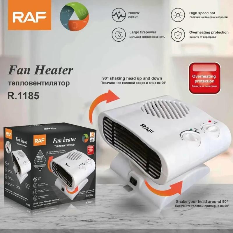 Тепловентилятор 2000 Вт RAF-1185 для дому поворотний Тепловентилятор RAF-1185 — це вже модернізований «дуйчик», який здатний повертатися на 90 градусів, не втрачаючи високих показників потужності, дуже компактний, простий і зручний в експлуатації, завдяки впровадженню нових технологій збільшує передавання корисного об'єму повітря, що так само сприяє швидкому обігріванню приміщення. Тепловентилятор 2000 Вт RAF-1185 Тепловентилятор RAF 1185 — це вже модернізована «повітря», яка здатна повертатися на 90 градусів, водночас не втрачаючи високих показників потужності, дуже компактна, проста та зручна в експлуатації, завдяки впровадженню нових технологій збільшується передавання корисного об'єму повітря, що так само сприяє швидкому обігріванню приміщення (у разі дотримання правил експлуатації) Характеристики RAF 1185: Площа обігрівання — до 22 кв.м. Потужність -2000 Вт Нагрівач — спіральний трубчастий електронагрівач Напруга — 220-240 В Керування — механічне Корпус-поворотний, 90 градусів Колір Білий Розміри: 240*150*200мм Особливості RAF 1185 корпус виготовлений із термостійкого, міцного пластику, світловий індикатор, аварійне вимкнення у разі падіння, термостат, запобіжник від перегрівання, завдяки обертанню на 90 градусів забезпечує рівномірне подавання гарячого повітря і скорочує час на обігрівання приміщення, 3 режими роботи Розміри паковання — 240*165*205мм Виробник — Китай