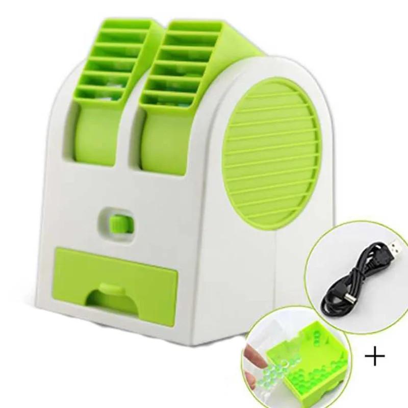Мини вентилятор для рабочего стола (работа от USB или батареек ААА) Зеленый Быстрая прохлада и максимальный комфорт. Мини кондиционер может работать всего от 5 Вт, можете подключить его от зарядного устройства смартфона, ноутбука, компьютера и power bank с помощью стандартного USB-кабеля. размер 13х10х10см напряжение 2,5 Вт есть отсек для ароматизатора/воды/льда
