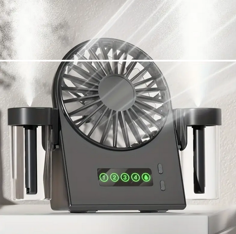 Портативний настільний вентилятор із зволожувачем повітря 3 регульовані швидкості - 2000/3000/3200/4100 об/хв. Швидкість повітряного потоку: 2-3,42 м/с. Радіус дії вентилятора: 1 м Флакончики з водою можуть нахилятися на 90°. Легко складається та переноситься. Дуже тиха робота. Заряджається від USB-кабелю (входить до комплекту). Довжина кабелю: 0.7м. Місткість акумулятора: 1200 мАг. Час роботи від акумулятора – 1. швидкість (5 год роботи від акумулятора), 2. швидкість (4 год роботи від акумулятора), 3. швидкість (3,5 год роботи від акумулятора). Резервуар для води 60мл.