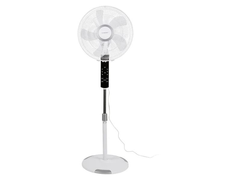 Вентилятор SilverCrest. Зручний світлодіодний дисплей та пульт дистанційного керування. З 4 режимами вентиляції, 6 швидкостями та функцією 8-годинного таймера. Кут нахилу регулюється, а широка основа забезпечує вентилятору стабільне положення. Потужність: 60 Вт. Регульована висота: 114-135см. Лопаті ротора: Ø40см.