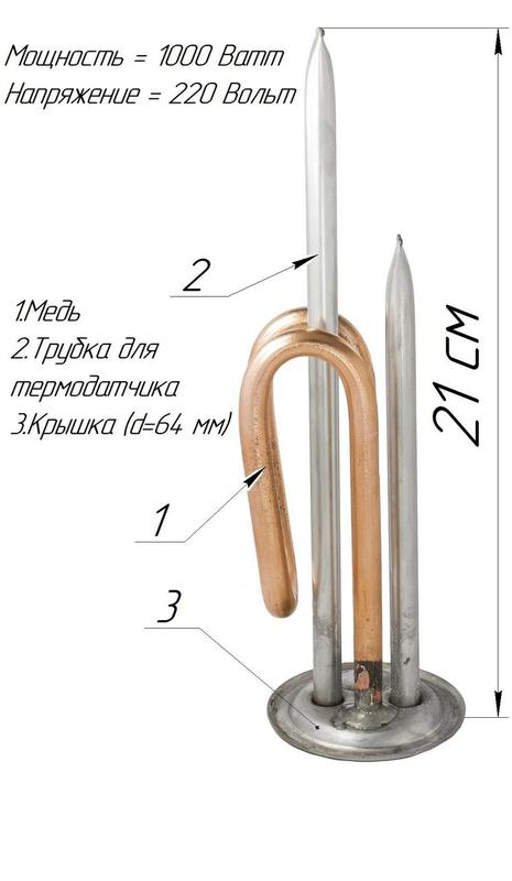 ТЕН зігнутої форми з мідною/нержавіючої оболонкою, трубкою під два термодатчика, кришка нержавійка (d=64)з гідроізоляцією, P=1000 Вт, V=220 В Оболонка - Мідь Кришка d=64мм