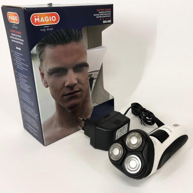 Электробритва MAGIO MG-685 для влажного и сухого бритья с тремя подвижными бритвенными головками обеспечит идеальный результат за счет плотного прилегания вращающихся лезвий к коже. Эта модель роторной бритвы с качественными двойными лезвиями и системой повторения контуров лица деликатно относится к коже. Аккумулятора после 8-ми часовой зарядки хватает на 30 минут автономной работы. Ухаживать за бритвой проще простого, достаточно просто промыть ее режущий блок под проточной водой не более 5-ти секунд. Три плавающих головки, триммер для подравнивания висков, эргономичная рукоятка делают использование прибора комфортным и безопасным.