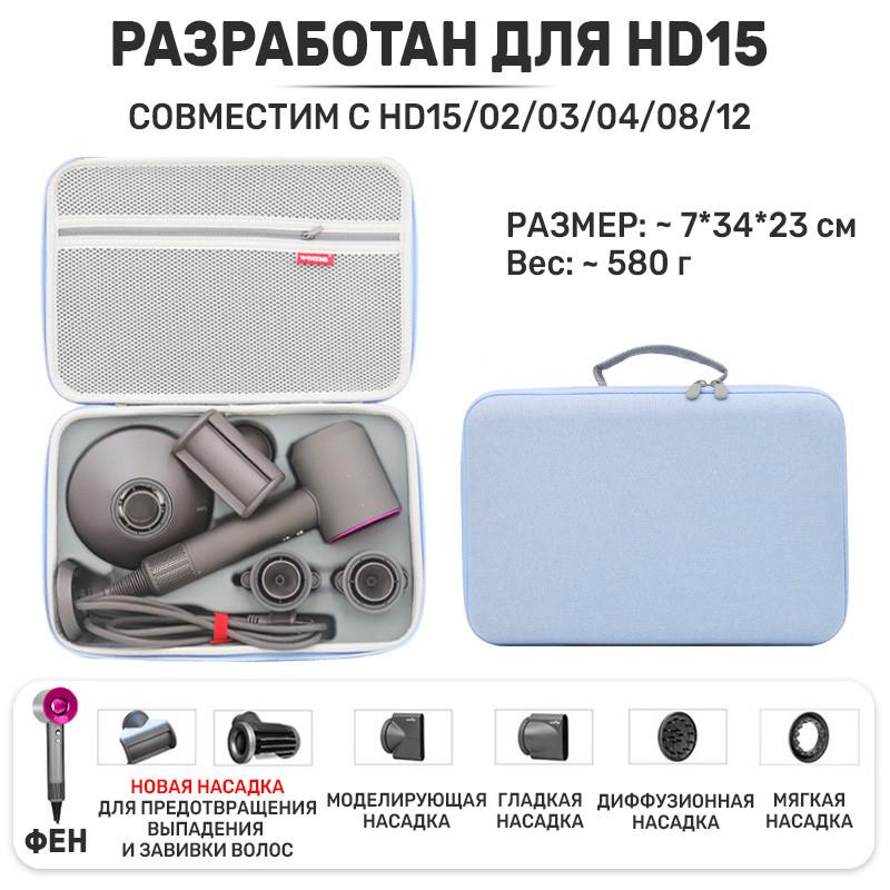 Ударостійкий, вологостійкий, пилозахисний чохол для фена DYSON HD**********/15 Для захисту та дбайливого зберігання фена та насадок спрямованого потоку або насадок-концентратора. Дозволяє дбайливо зберігати фен для волосся, захищає від пилу, появи подряпин та вм'ятин. Ідеально підходить для подорожей та домашнього зберігання Вашого фена