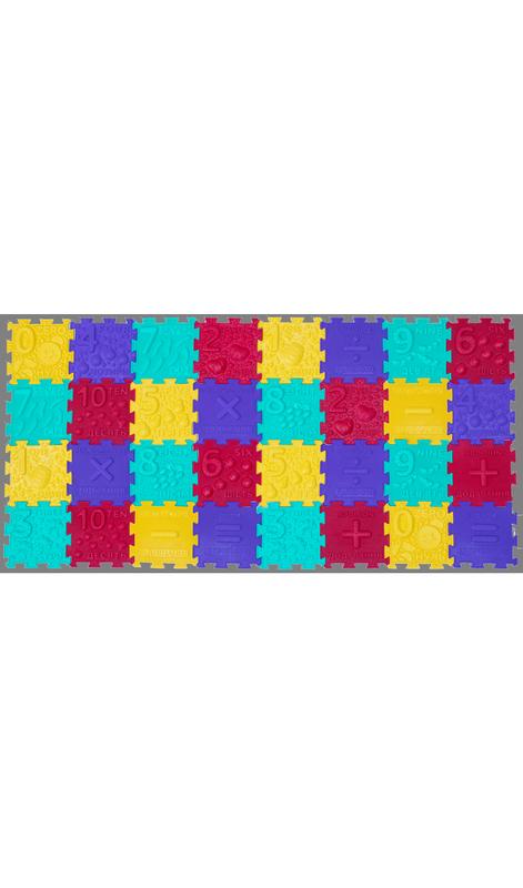 Килимок масажний Ортек "Математика" Масажний килимок складається з 32 пазлів, виготовляється з гігієнічного, гіпоалергенного матеріалу на основі ПВХ. Розмір модуля: 13,5 * 13,5 см Крім масажу стоп, за допомогою пазлів ви зможете вчити дітей рахувати, складати приклади. Кількість овочів та фруктів відповідає цифрі на елементі - це допоможе в рахунку та приверне увагу дитини. Назви цифр та математичних дій українською та англійською мовами. Що може масажний килимок: - сприяє правильному формуванню дитячої стопи, масажує, тренує та зміцнює стопи; - допомагає у профілактиці плоскостопості, клишоногості, вальгусної деформації та інших деформацій; - розвиває дрібну моторику, сенсорні відчуття та навички в рахунку; - допомагає при набряках, відчутті тяжкості та втоми в ногах. Протипоказання: - відкриті рани чи запальні процеси на шкірі стопи; - синдром діабетичної стопи. Колірна гама може відрізнятись від представленої на сайті. Комплекс вправ: 1. Ходьба по килимку вперед-назад (20-30 секунд). 2. Становище стоячи, підніматися на шкарпетки (7-9 разів). 3. Стоячи, перекочуючи з п'яти на носок (20-30 секунд). 4. Ходьба на внутрішній стороні стопи (20-30 секунд). 5. Ходьба на зовнішньому боці стопи (20-30 секунд). 6. Ходьба на шкарпетках (20-30 секунд). 7. Присідання (7-9 разів). 8. Стоячи, утримання рівноваги однією, потім іншій нозі (10-20 секунд). 9. Стрибки по пазлам (7-9 разів). 10. Стрибки на одній, потім на іншій нозі (7-9 разів). 11. Напівприсід, ходьба по килимку (10-20 секунд).