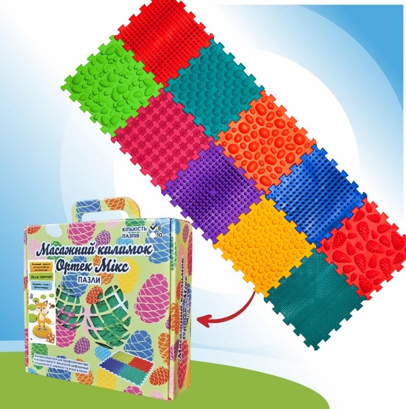 Масажний ортопедичний килимок Ortek Пазли з настільною грою "Лісові пригоди" До комплекту входять: настільна гра і масажний килимок Пазли Мікс на 10 елементів. Розмір модуля: 26 * 26 см. Ходити по масажному килимку дуже корисно. Але не завжди діти охоче це роблять. При цьому діти люблять грати. Гра "Лісові пригоди" зробить вправи на масажному килимку дійсно цікавими для дітей і дорослих. У грі можуть брати участь від 1-го до 4-х чоловік. "Лісові пригоди" сподобаються як дітям, так і дорослим. Гра відмінно підійде як для одного або двох гравців, так і для гри в колі сім'ї. Як грати? Гравець кидає гральні кістки і ходить фішкою по ігровому полю. У процесі гри виконуються завдання з карток, та так само від казкових персонажів, які зустрічаються на ігровому полі у процесі гри. Що може масажний килимок: - сприяє правильному формуванню дитячої стопи; - покращує тонус м'язів, зміцнюючи поздовжній і поперечний звід стопи; - активно впливає на поліпшення кровообігу; - знімає напругу в ногах. Застосування: - профілактика плоскостопості, клишоногості, вальгусної та інших деформацій стопи; - профілактика варикозного розширення вен, артрозу і артриту; - полегшення при відчутті втоми в ногах; - масаж стоп. Усі пазли виробляються з одного матеріалу - безпечного, гіпоалергенного ПВХ без шкідливих домішок. Але завдяки різним текстурам відчуваються по-різному. Травка, мушлі, галька, гриби відносяться до більш м'яких пазлів. Вежі, Їжачки, Морські, Жолуді - до середніх. Піраміда, Шипи, Лотос, Шишки відносяться до більш твердих пазлів. Вплив поверхонь різної твердості надає найкращий ефект для масажу, тренування стоп та сенсорної інтеграції. Протипоказання: - відкриті рани або запальні процеси на шкірі стопи; - синдром діабетичної стопи. Також, крім комплектації з восьми частин, в наявності є килимки з 4, 6 і 8 елементів. Комплектація і кольорова гамма може відрізнятися від представленої на сайті. Крім гри, можна так само робити вправи наведені нижче. Комплекс вправ на масажному килимку: 1. Ходьба по килимку вперед-назад 2. Перекочування з п'яти на носок 3. Ходьба на внутрішній стороні стопи 4. Ходьба на зовнішній стороні стопи 5. Ходьба на носочках 6. Початкове положення - стоячи, присідання спираючись на всю стопу, не відриваючи п'яти від килимка 7. Початкове положення - стоячи, утримуючи рівновагу на одній нозі 8. Стрибки з елемента на елемент 9. Початкове положення - стоячи на одній нозі стрибки на іншій нозі, чергуючи ногу 10. Початкове положення - напівсидячи, ходьба по килимку