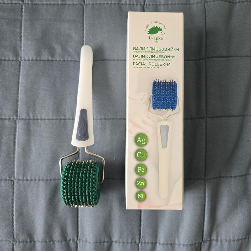 Валик для обличчя Н 3,5 Ag (з гумовими втулками) - крок голки - 3,5 мм, ширина - 40 мм, діаметр 51мм, к-ть голок 272. Розроблений спеціально для обличчя і зони волосистої частини голови. Також дає можливість обробляти практично будь-які ділянки тіла (зони дрібних суглобів кінцівок, кисті та стопи), для зняття болів і спазмів. Рекомендований для застосування в косметології і для точної рефлекторної діагностики. Терапевтичний ефект досягається у декілька разів швидше, ніж при застосуванні статичного аплікаційного пристрою. Гальванічний струм, що виникає в шкірі, на вістрях і між голками, носить імпульсний характер. Завдяки гнучким боковим гумовим втулкам виявляється м'якша, делікатніша дія на шкіру. Методика застосування Застосовується для терапевтичної дії на невеликі і делікатні ділянки тіла - голови, обличчя, шиї, декольте, грудей і живота. Найчастіше Валик Лицьовий використовують для косметичного масажу обличчя. Під час масажу голками аплікатора відбувається дія на судинну систему, що стимулює кровообіг в тканинах, роботу метаболізму, регенерацію шкіри і поліпшення роботи клітин в цілому. Працюють валиком по чистій шкірі, яку попередньо можна обробити тоніком. Після процедури в зоні застосування покращено кровообіг, пори «розкриті», тому нанесення поживних кремів сприяє кращому проникненню в шкіру і посиленню їх дії. Використовуючи валик, можна зробити заспокійливу (седативну) або збудливу (тонізуючу) дію. Для отримання заспокійливого ефекту сеанс триває 10-15 хвилин з охопленням великої ділянки поверхні тіла. При сеансі лікування по збудливому методу робиться швидка інтенсивна дія впродовж 5-7 хвилин, але із захопленням меншої площі тіла. Стандартний курс 1-2 тижні. Перерва 1 тиждень. Для косметичного ефекту 12 курсів в рік. Голки валика, стикаючись з шкірою, не ушкоджують її. Метод ефективний і неінвазивний, тобто повністю виключає перенесення інфекції (вірусного гепатиту, СНІДУ). За допомогою цього виду валиків можна проводити рефлекторну діагностику як захворювань, що проявили себе, так і прихованих. Діагностичний метод грунтований на тому факті, що на шкірі людини знаходяться певні зони проекції вісцелярних (внутрішніх) органів. У цих зонах при захворюванні відповідних органів з'являються зміни у виді гіпо- або гіперестезії (порушення чутливості), підвищення або пониження температури, посилення або зменшення кровонаповнення (зміна кольору шкіри від різкої блідості до інтенсивного почервоніння), появи місцевого набряку.