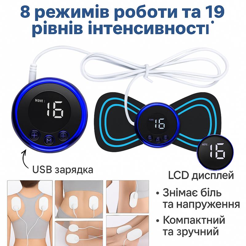 Сучасний електромасажер EMS -- це компактний пристрій для розслаблення м'язів, зняття болю та напруги після фізичних навантажень або сидячої роботи. Він працює за технологією електричної стимуляції м'язів (EMS), що покращує кровообіг, знімає втому та допомагає підтримувати тіло в тонусі. Масажер має 8 режимів роботи та 19 рівнів інтенсивності, що дозволяє індивідуально підібрати комфортний рівень впливу. На зручному LCD дисплеї відображаються налаштування, а USB зарядка робить пристрій зручним у використанні вдома або в дорозі. Підходить для спини, шиї, рук, ніг, колін та стоп. --- ✅ Переваги: 8 режимів масажу та 19 рівнів інтенсивності Ефективно знімає біль і м'язову напругу Покращує кровообіг та загальний стан Компактний, легкий і портативний дизайн Зручний LCD дисплей для контролю USB зарядка -- не потребує батарей Підходить для будь-якої ділянки тіла --- ⚠️ Мінуси: Не рекомендується для людей із кардіостимуляторами Не можна використовувати на пошкодженій шкірі Не підходить для використання у воді або під час сну --- 💡 Характеристики: Тип: електростимулятор EMS Кількість режимів: 8 Рівнів інтенсивності: 19 Живлення: USB Матеріал: ABS + гель-подушки Розмір: 6×6 см (модуль), 15×6.5 см (електрод) Колір: чорний із синім підсвічуванням