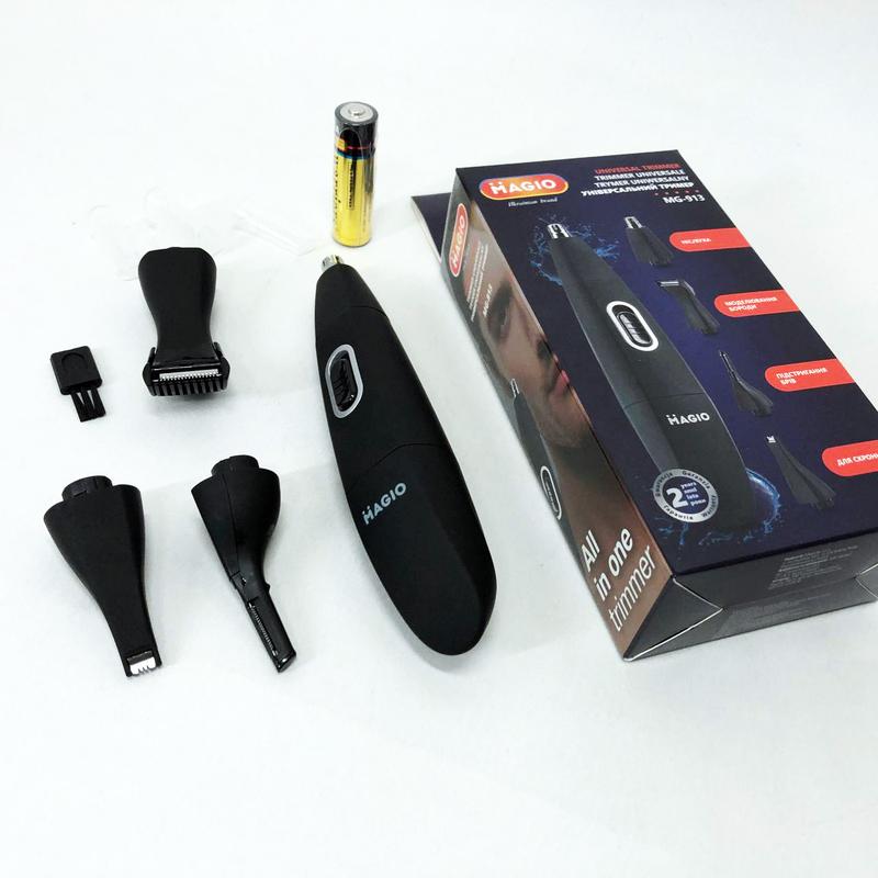 Багато чоловіків голяться щодня; але ігнорують волосся у носі; вухах; на бровах; скронях; шиї та підтримка бороди у доглянутому вигляді. Універсальний триммер MG-913 ідеальне рішення для видалення небажаного волосся та моделювання волосся; дуже зручний та багатофункціональний; дозволить підстригти волосся на голові; видалити волосся з вух та носа; а також упорядкувати і постійно підтримувати в ідеальному стані брови; вуса та бороду. Універсальний тример MG-913 має гарний дизайн із Soft touch покриттям; компактний та зручний у руці. Низький рівень вібрації та шуму. Працює від однієї батареї типу АА (входить до комплекту); а також є водонепроникним; що полегшує використання та дозволяє користуватися ним у душі. Леза виконані з нержавіючої сталі із технологією Protect cut; що забезпечує безпечну та комфортну роботу з триммером та захищає шкіру від подразнення. Лезо після використання можна чистити за допомогою щіточки; яка йде у комплекті; а також можна промивати під струменем води. Насадки, що знімаються і миються, легко знімаються і очищаються. Корисний аксесуар; такий як мішечок; полегшує зберігання всього комплекту тримера та є ідеальним варіантом для подорожей. Порада - після використання тримера у воді; обов'язково потрібно витерти прилад насухо, щоб запобігти росту бактерій та забезпечити тривалу роботу. Універсальний тример MG-913 має 4 насадки: насадка для стрижки в носі та вухах (1; 5 мм). За допомогою цієї насадки можна швидко; безпечно та безболісно видалити небажане волосся у носі та вухах. Абсолютно не ушкоджує ніс та вуха та їх шкіру. Порада - щоб уникнути травмування носа та барабанної перетинки не варто встановлювати насадку в ніс і вухо глибше 1 см. Насадка-тонкий триммер для створення контурів бороди або еспаньйолки (0;8 мм). За допомогою такої насадки можна делікатно та акуратно моделювати різноманітні стилі та форми бороди; у тому числі і еспаньолки; дозволяє точно і рівно підстригти будь-який контур. Насадка для бороди; скронь та шиї (0;8 мм) з насадкою-гребінцем для регулювання довжини (3; 4; 5; 6; 7 мм). Достатньо корисна і потрібна насадка; за допомогою якої з легкістю можна опрацювати такі зони; як віскі (бакенбарди); борода та шия. Ідеальний варіант для стрижки будь-якої бажаної довжини бороди; завдяки спеціальній насадці- гребінці з регулюванням довжини. Порада - для моделювання скронь проводити пристроєм обов'язково зверху донизу; а при моделюванні шиї - знизу нагору! Насадка для стрижки брів (0; 5 мм) з насадками-гребінцями для регулювання довжини. Ідеальний варіант для моделювання брів; оскільки завдяки насадкам-гребінцям у наборі; є можливість регулювати різну довжину брів. Насадка дуже зручна у використанні; дозволяє дуже легко зробити корекцію брів. Порада - спочатку бажано вибрати насадку-гребінець з більшою довжиною; щоб не зрізати більше волосся, ніж потрібно; а якщо хочеться видалити більше волосся; тоді замінити ту; що з меншою довжиною. Універсальний триммер MG-913 4 в 1 задовольнить будь-які потреби у догляді за собою! Характеристики - Тип: для носа та вух - Леза з нержавіючої сталі - Живлення: від батарейки типу АА (1шт) - Насадки: 4 шт - Колір: чорний