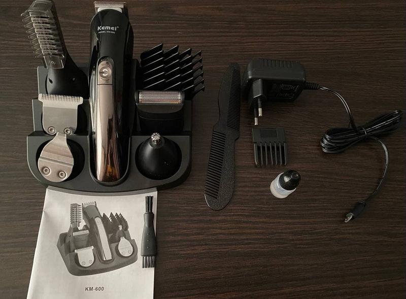 Тример для бороди голови, машинка тример професійний (111 в 1), NST Характеристики - Призначення: Борода, Вуса, Нос, Вуха, Тіло, Обличчя; - Потужність: 5 W; - Тип живлення: Акумулятор; - Тип акумулятора: NiMH; - Корпус: пластиковий; - Леза: нержавіюча сталь; - Насадки: 11 шт.; - Мінімальна довжина стриження: 1 мм; - Максимальна довжина стриження: 12 мм; - Інтервал довжини: 1 мм; - Можливість промивання ножів під водою: Так; - Самозаточувальні леза: Так; - Час безперервної роботи: 80 хвилин; - Час заряджання: 2 години; - Довжина мережевого шнура: 1 м; - Колір: Чорний. Комплектація 1. Тример 2. 11 насадок 3. Олія для змащення; 4. Гребінець; 5. Підставка; 6. Блок для заряджання приладу.