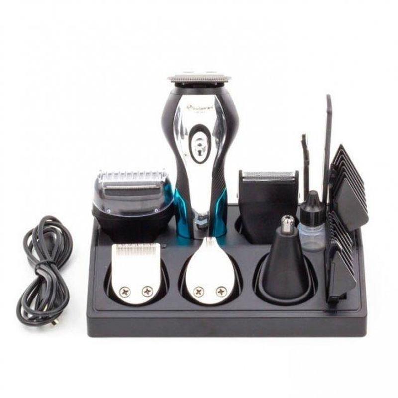 Триммер для бороды и волос на голове (11в1), Триммер для бороды с насадками, NST Набор для стрижки волос и бороды 11 в 1 Включает в себя полную комплектацию всех необходимых аксессуаров для ухода за волосами от головы до ног. Включает в себя бритву, триммер для носа и ушей, машинку для стрижки с 3 сменными насадками (3мм, 6мм, 9мм), насадку для подравнивания бороды и бакенбард. Имеет 2 скорости работы в турбо режиме. В комплекте имеется специальная насадка-триммер для комфортной стрижки и удаления волос на теле. При помощи тонкой насадки для бороды и бакенбард, вы сможете делать различные стильные рисунки. Для поддержания максимальной гигиены, прибор можно мыть под струёй воды. В комплекте зарядное устройство, шнур с сетевым адаптером 220V. Удобная подставка для вертикального хранения. Расческа, щеточка для очистки и масло для лезвий также в комплекте. Комплектация и характеристики: - Питание: от аккумулятора до 90 минут работы, а также от сети 220В - Головки: машинка-триммер для стрижки, бритва, машинка для стрижки волос носа и ушей, точная окантовочная насадка для узоров, бороды и бакенбард, насадка-триммер для тела - Насадки: 3 насадки 3, 6, 9мм, + насадка для точного триммера 3мм - Комплектация: Машинка, съемный триммер для стрижки, 4 насадки, съемный окантовочный триммер, съемный триммер для носа и ушей, съемный триммер для точного формирования контуров, съемная сеточная бритва, съемный триммер для тела, зарядное устройство + кабель, кисточка для чистки, расческа, подставка, инструкция.