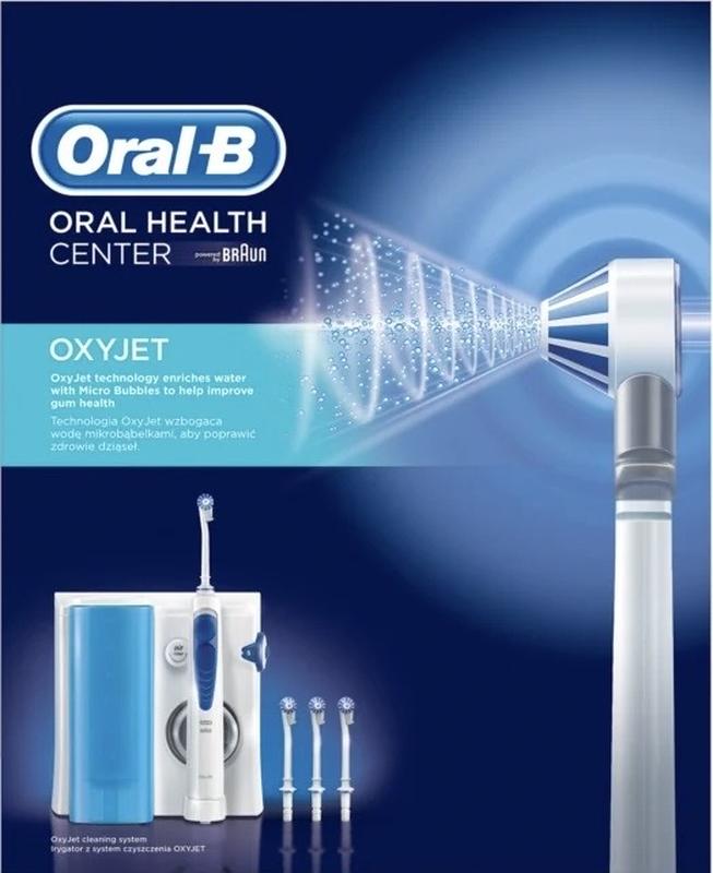 засіб для полоскання рота + змінні щітки Опис Стандартна зубна щітка не здатна усунути зубний наліт на 100 %. Саме тому Oral B створив спеціальний засіб для очищення ротової порожнини, який вичищає проміжки між зубами й інші місця, куди зубна щітка не дістанеться. За допомогою м’якого струменя води в поєднанні з технологією мікробульбашок іригатор Oral B Oxyjet MD 20 ретельно видаляє бактерії та зубний наліт. Регулярне використання цього засобу допоможе вам позбутися кровоточивості ясен та значно зменшить кількість бактерій у ротовій порожнині. Властивості: очищує проміжки між зубами та важкодоступні місця видаляє 100 % бактерій зубного нальоту масажує ясна та зменшує кровоточивість залишає відчуття чистоти та свіжості в ротовій порожнині ідеальне доповнення до щоденного чищення зубів підходить для використання з брекетами, імплантатами мостами та коронками Технічні характеристики: технологія мікробульбашок — видаляє зубний наліт спіралеподібний потік — очищує та масажує ясна прямий монопотік — уможливлює чищення конкретних місць безперервна регуляція водного потоку (0,2–0,6 МПа) запобіжник проти ненавмисного послаблення форсунки об’єм контейнера для води: 600 мл максимальний час роботи: 15 хв 4 змінних форсунки Спосіб застосування: Наповніть контейнер водою та насадіть на тримач форсунку. Налаштуйте необхідний тиск води та піднесіть форсунку до зубів і ясен. Нахиліться над умивальником і ввімкніть за допомогою перемикача подачу води. Рот тримайте злегка відкритим, щоб вода могла стікати в умивальник. Направляйте форсунку на кожен зуб почергово. Після використання вилийте залишок води, а пристрій ретельно очистіть. Рекомендовано заміняти форсунку на нову кожних 3 місяці.