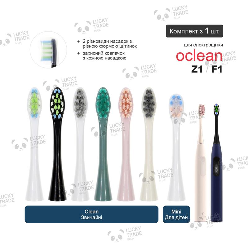 ▷ Все цвета данного товара посмотреть можно тут ◁ 1 шт. Насадка зубной щетки Xiaomi Oclean F1 / Z1 Sonic Electric Toothbrush Данный товар произведен сторонним производителем, но имеет хорошее качество и относительно небольшую цену. В насадке используються высококачественные антибактериальные щетинки высокой плотности из материала фирмы DuPont. Верх щетинок закруглен во избежание кровоточивости десен. Каждая насадка с защитным колпачком в индивидуальной вакуумной упаковке, предварительно стерилизована ультрафиолетовыми лучами. При изготовлении насадок используется новый процесс посадки волос без меди, нижняя часть щетины формируется в единое целое путем горячего плавления. Насадки высокого качества обеспечивают профессиональный уход за полостью рта. Щетинки высокой плотности, эффективно очищают полость рта. Насадка плотно сидит на щетке без люфта. Через 3 месяца обычного использования насадки головка щетки изнашивается и очищающая способность снижается. Рост бактерий угрожает здоровью полости рта, поэтому рекомендуем вам заменять насадку через каждые 3 месяца использования. Есть такие разновидности насадок: • Clean (обычные) – Белый, Черный, Серый, Зеленый, Розовый, Бежевый • Mini (для детей) – Белый Комплектация: насадка 1 шт в индивидуальной вакуумной упаковке. ⚡ при покупке 3 одинаковых насадок, насадки будут дополнительно в коробке. Среди совместимых моделей: • Oclean Z1 • Oclean F1 ✅ для более подробной информации о совместимости насадок к вашей электрощетке от Oclean обращайтесь к нашему консультанту. 🔔 Характеристики и комплектация товара могут изменяться производителем без уведомления