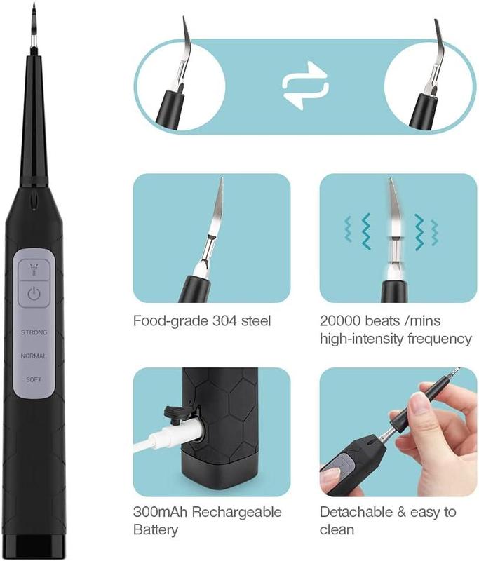 Набор для чистки зубов, водонепроницаемый очиститель для домашних зубов IPX6, 2 сменные чистящие насадки Бренд Flend 3 регулируемых режима: 3 различных режима работы: мягкий, нормальный, сильный 2 различных сменных безопасных материала: 2 разных типа замены: плоская для поверхности и другая для зазора, изготовлена из безопасной нержавеющей стали 304, безопасна и легко чистится. Перезаряжаемая через USB: оснащена аккумулятором емкостью 300 мАч и перезаряжаемым USB-портом, поэтому никогда не беспокойтесь о том, что заряд батареи закончится во время путешествий или деловых поездок. Светодиодная подсветка: передняя дополнительная светодиодная подсветка обеспечивает более комфортное прикосновение и круговой обзор во время уборки, обеспечивает безопасность и помогает достичь удовлетворительного результата уборки.