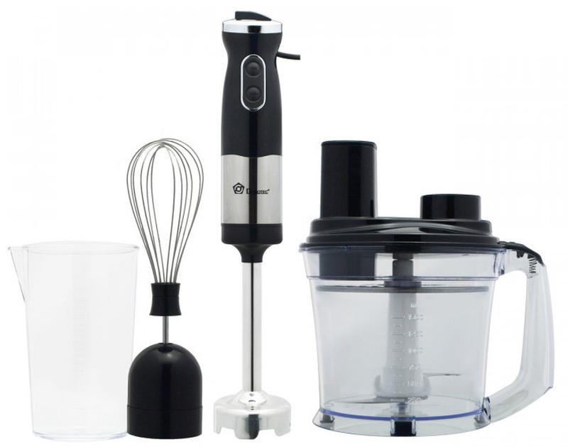 Опис Блендера 5 в 1 Domotec MS 5106 Занурювальний блендер Domotec MS-5106 використовується для подрібнення, змішування та збивання продуктів. Простий у використанні, надійний та безпечний. Завдяки потужності 800 Вт та гострому ножу з нержавіючої сталі швидко перемелює фрукти, ягоди, овочі, горіхи, робить фарш. Швидкість роботи плавно регулюється. Також є турбо режим. У великій чаші на 1.7 літра з диском для терки та шатківниці відмінно вийде фарш, паштет, тісто для млинців та багато іншого. Для приготування смузі та коктейлів передбачена склянка ємністю 600 мл. Характеристики: Ергономічний дизайн; Потужність: 800 Вт; Матеріал: пластик; Матеріал ножів: сталь; Кількість насадок для нарізки та шаткування: 2; Кількість швидкостей: 2; Об'єм глека: 1.7 л; Розмір мірної чаші: 0,6 л; Колір: чорний. Комплектація: Блендер; Чаша-подрібнювач; Диск для терки та шаткування; Мірний стакан; Вінчик.